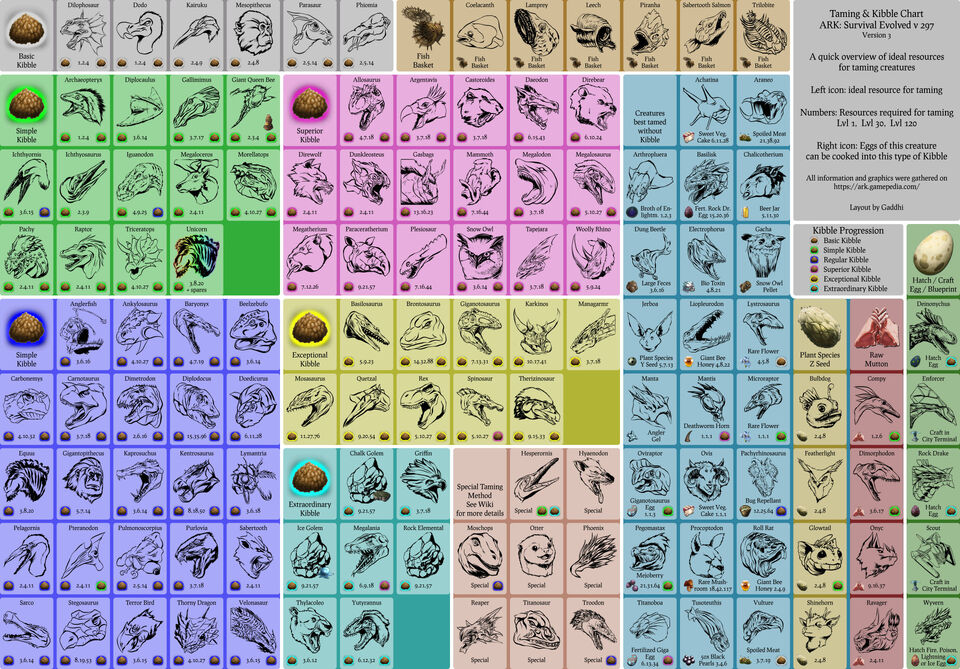 This kibble chart shows each creature's kibble. Dododex a companion app for ark: Using the taming calculator, you can estimate how long it'll take to tame almost any dinosaur as well as the food and narcotics required for each. Kibble has a higher taming effect than other food like berries or meat, meaning the taming meter will rise faster, while also dropping the taming effectiveness less, resulting in more extra levels when the. While the info below is current as of this writing and applies to most players, note that the reworked kibble system hasn't actually been implemented yet on mobile or switch editions of ark.